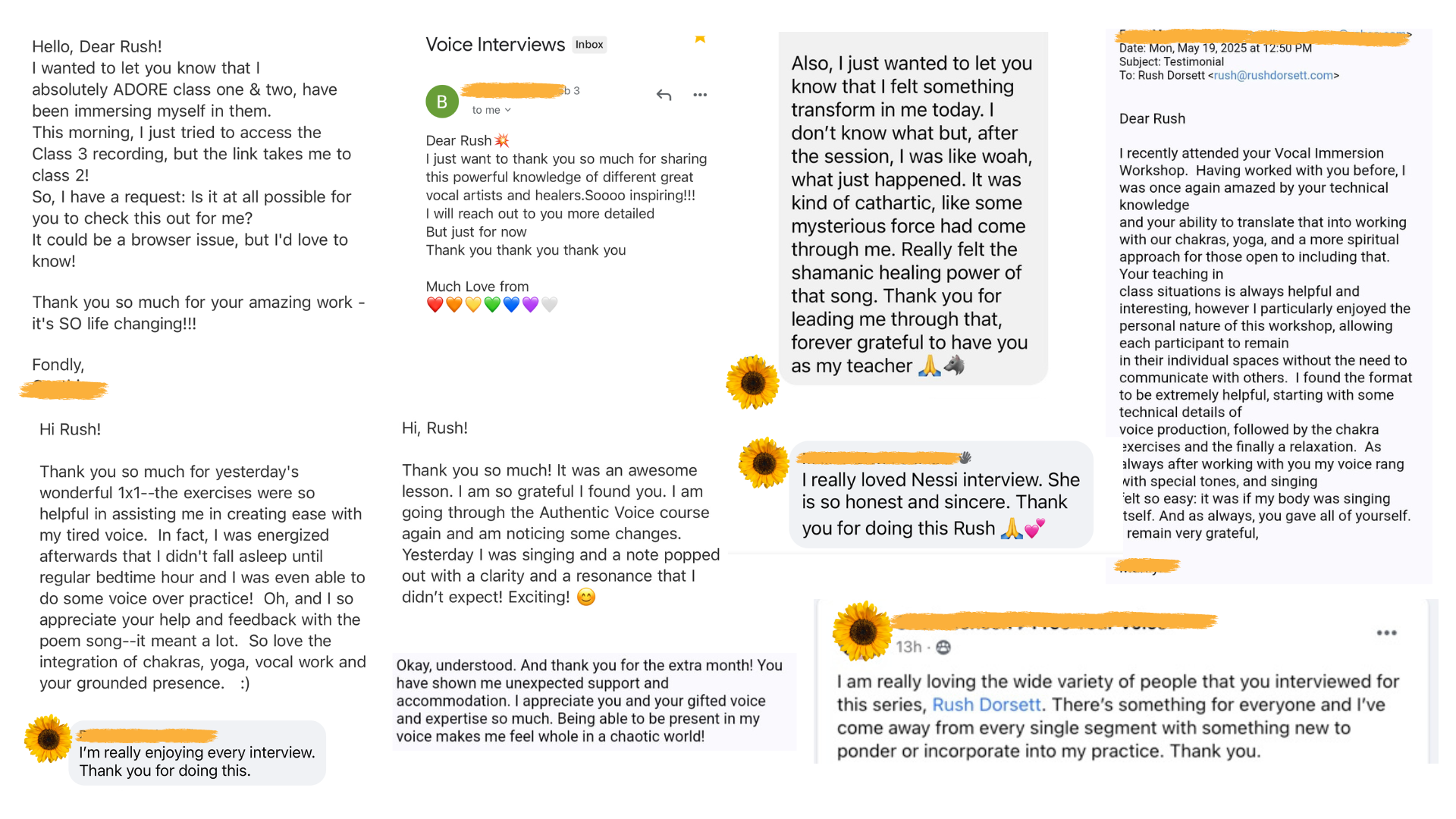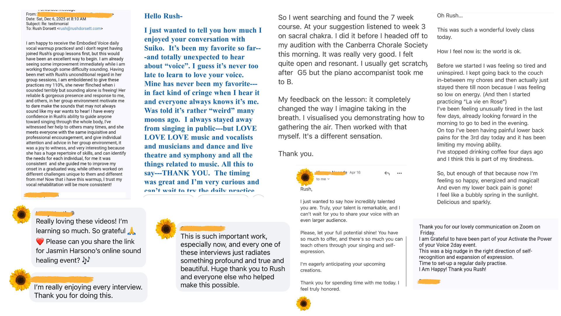The course has many interesting and instructive aspects. For one I just adored meeting my fellow singers on a regular basis and being able to learn with them and seeing their faces and hearing their input and thoughts. I loved that Rush uses voice yoga as well. I was fascinated by her technical knowledge and explanations as I had no idea what singing all involves. The 1x1 with Rush were very helpful, you get some attentive time with things you want to go over, need more explanation with or getting new ideas. The final retreat was a beautiful, heartwarming way to end the months we’ve all spent together.