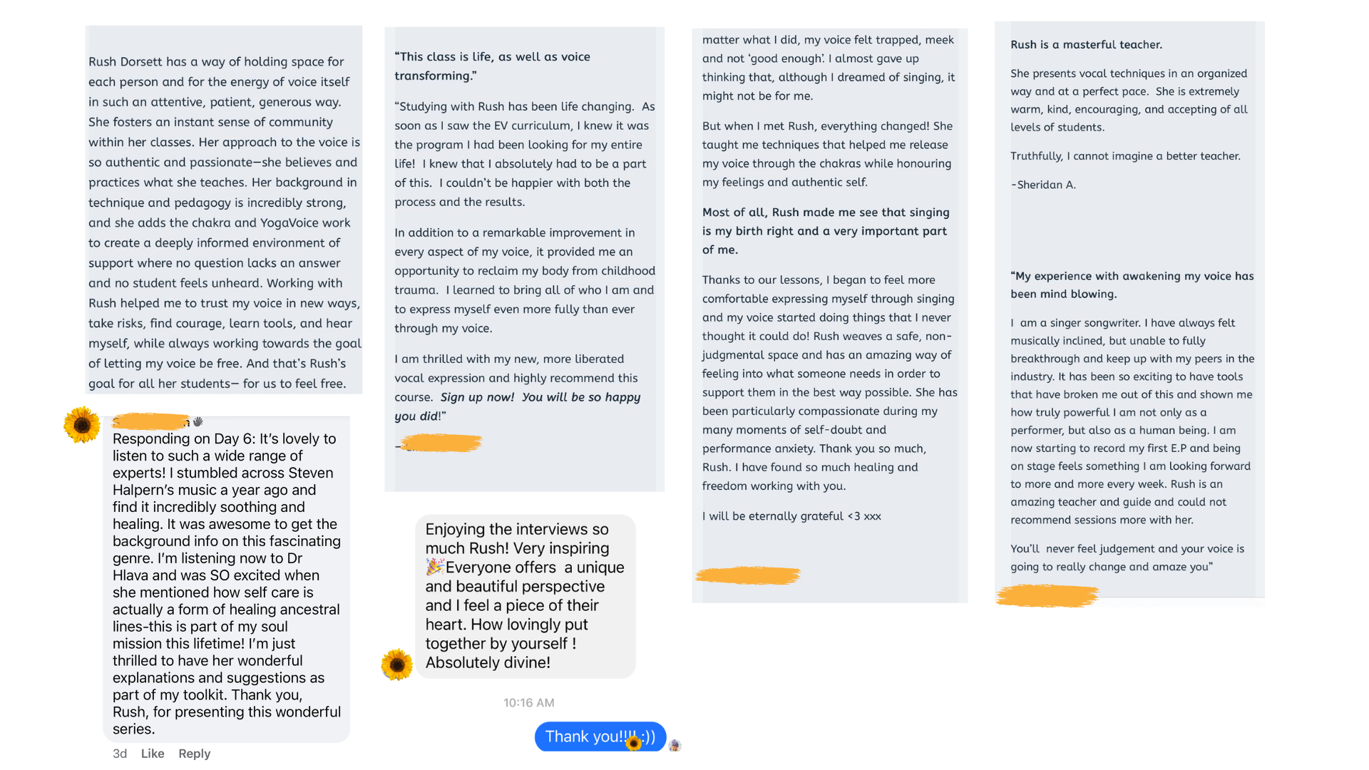 I found Rush’s chakra-voice course extremely helpful. Her method taught me how to achieve resonance without straining. My whole body feels alive with vibration when I’m concentrating on the focus points that this method has introduced me to. Rush is a masterful teacher. She presents vocal techniques in an organized way and at a perfect pace. She is extremely warm, kind, encouraging, and accepting of all levels of students. Truthfully, I cannot imagine a better teacher.