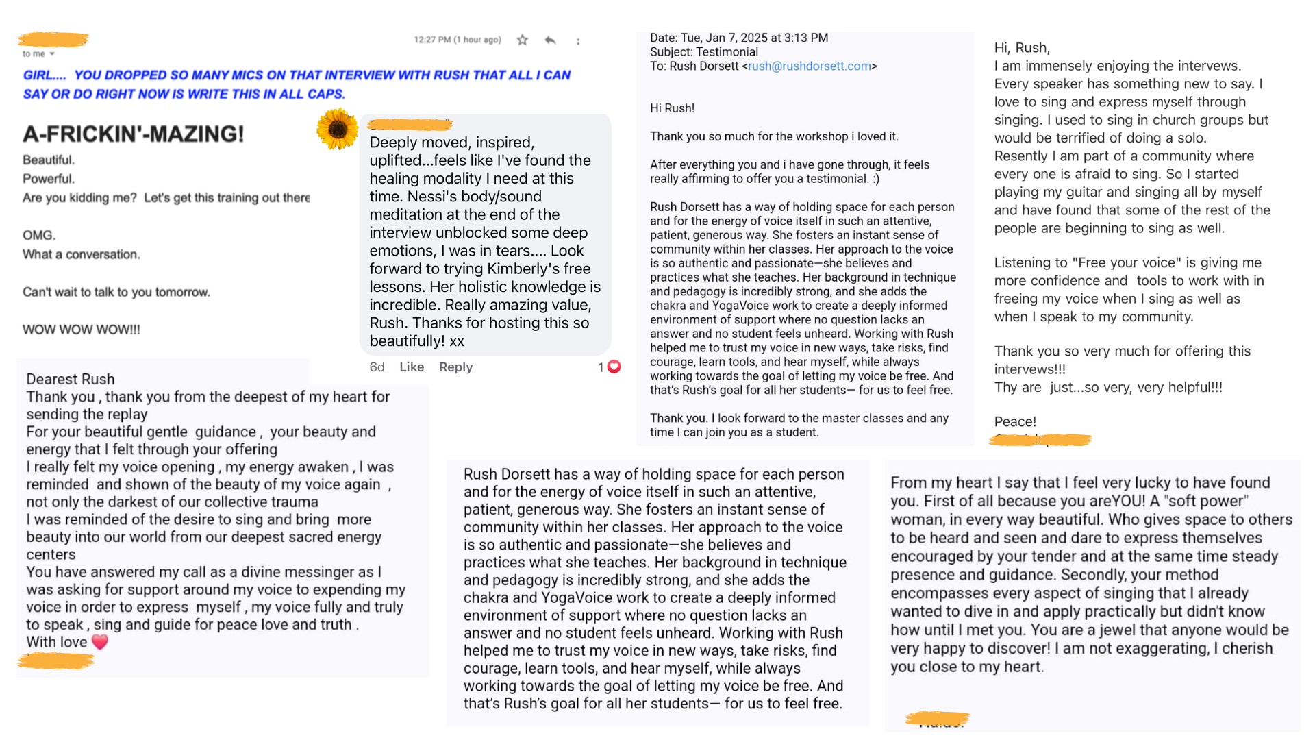 Rush helps me connect to my body and my voice in a way that translates to my daily life. She provides a safe space for me to express myself and my needs. This gives me more ease to feel and share my truth in daily life.